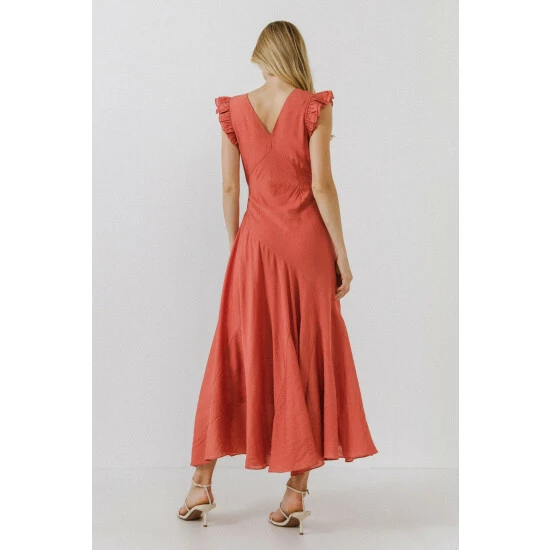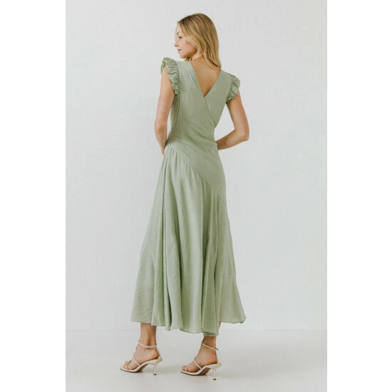 This dress is the definition of feminine chic. The asymmetrical seam and soft ruffle details make this dress a timeless piece. The two layers of ruffles on the sleeves create a flattering drape and delicate look.