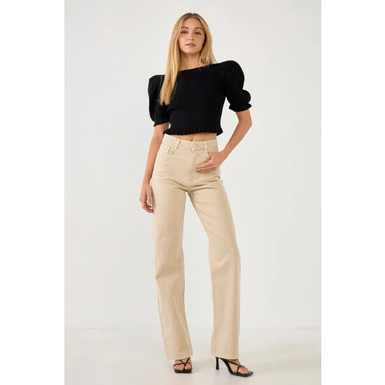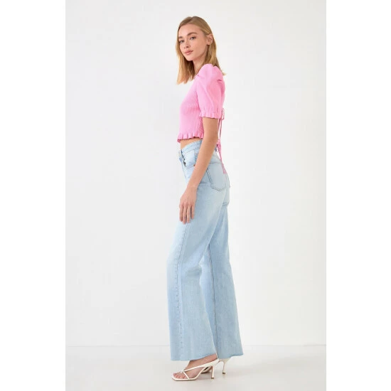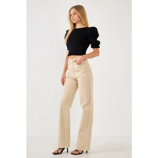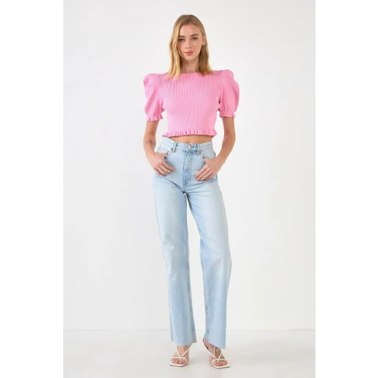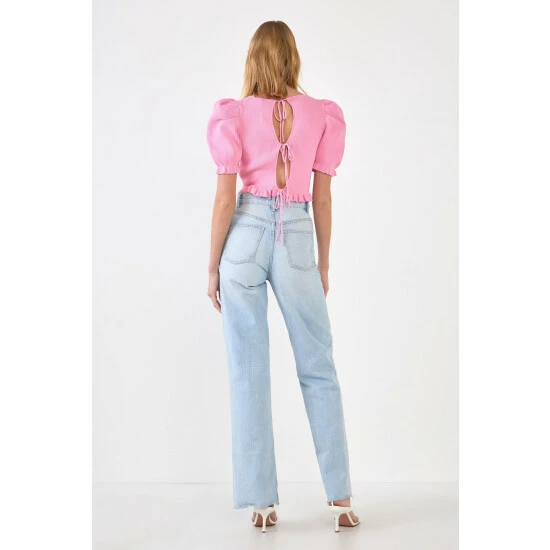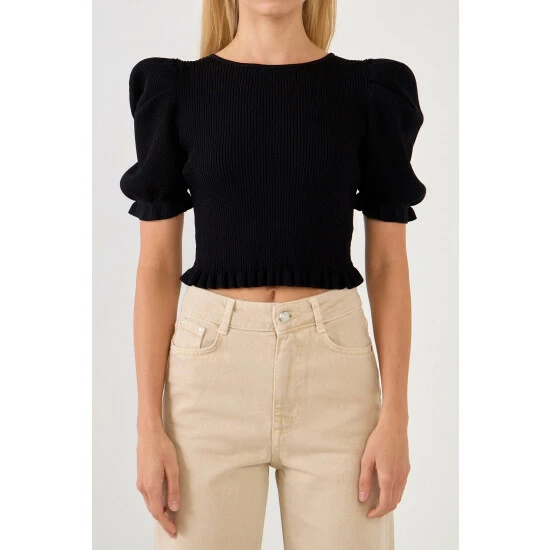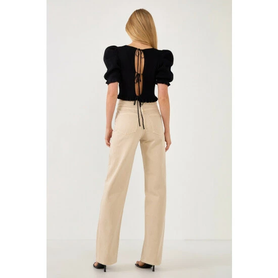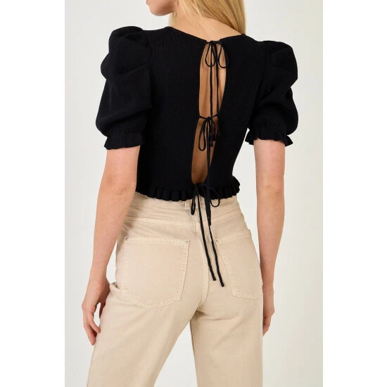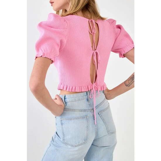 This crop top is a must-have for any fashion-savvy woman. The delicate back tied detail and ribbed knit fabric make it unique and stylish, while the puff sleeves add a touch of femininity. Whether you’re dressing up or dressing down, this top is perfect for any occasion.