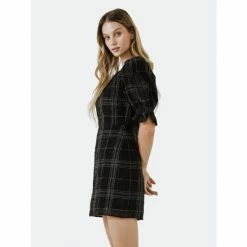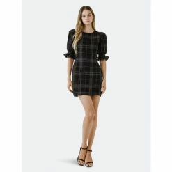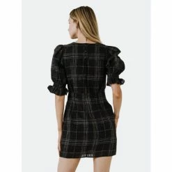– Check patterned- Short puff sleeves- Button closure at center back- Height 5’10”(178cm) / Bust 32”(81cm) / Waist 25”(67cm) / Hip 35”(89cm)