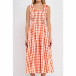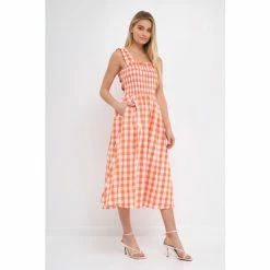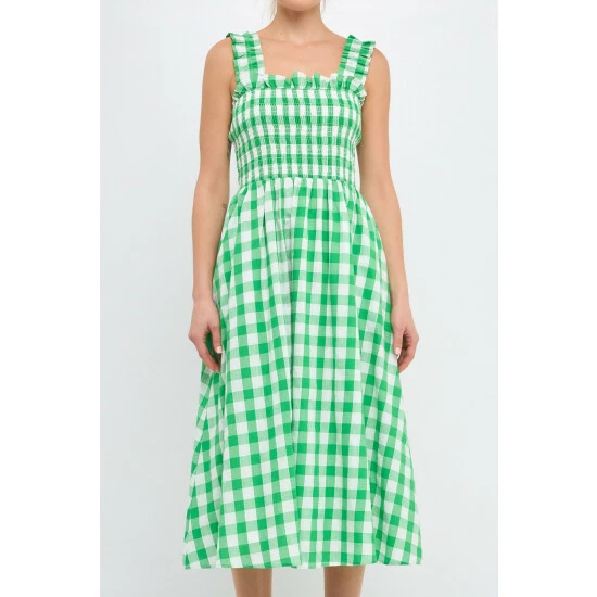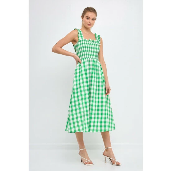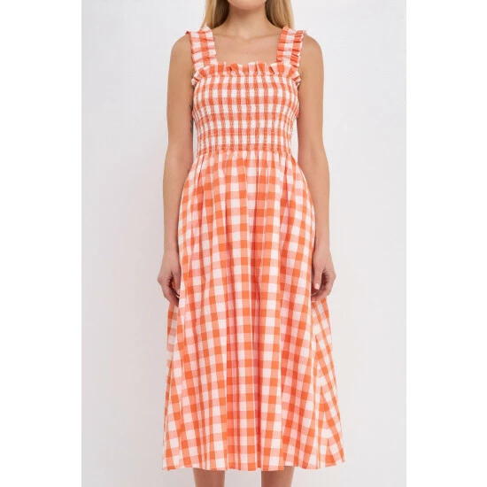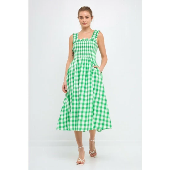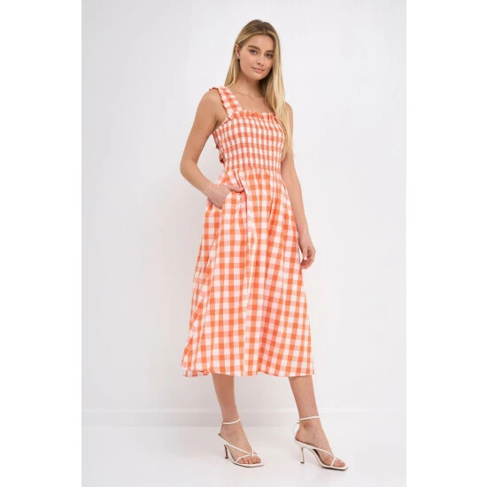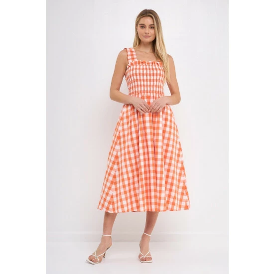 – Add a pop of pattern to your wardrobe with this check print smocked dress.- The smocked bodice provides a comfortable and flattering fit.- While the elastic back detail adds a touch of stylish flair. – The midi length makes it perfect for work or for a night out on the town.- Fully lined