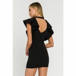 – Choker neckline- Mini length- Ruffle detail at shoulders- Sleeveless- Back invisible zipper- Hand wash cold- Do not bleach- Do not tumble dry- Iron low- Shell: 95% Polyester 5% Spandex- Lining: 100% Polyester- Total length: 32.50″, Bust: 32″