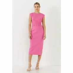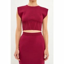 This sleeveless knit top is a great addition to any wardrobe. It features a cinched waist and comes in pink, making it the perfect choice for any occasion. Wear it with the matching skirt for a complete look, or style it with your favorite pants for a more casual look.