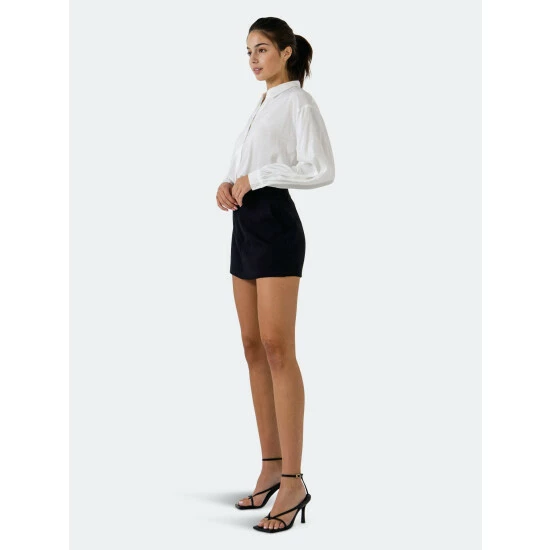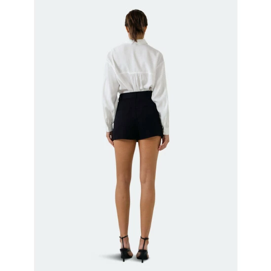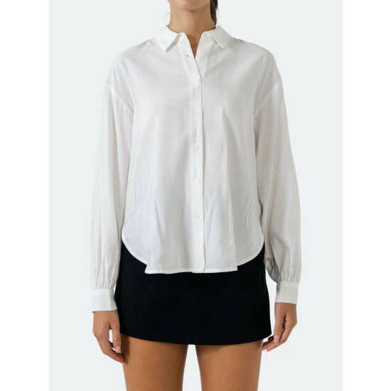 – Collared- Button down- High low- Blouson cuff sleeve- Lining- Total length: 27.50″, Bust: 42″