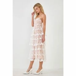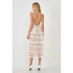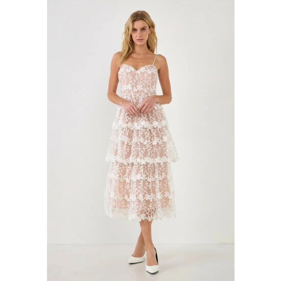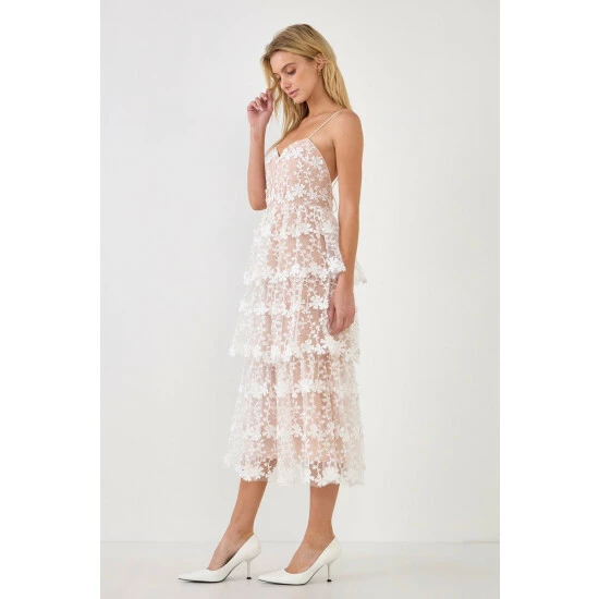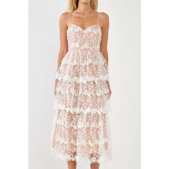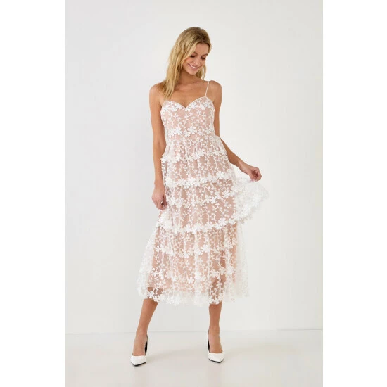 Add a touch of sweetness to your style with this crochet midi dress. This delicate dress features sheer lace fabric with a matching lining. The thin spaghetti straps and back tie detail add a touch of elegance, while the tiered skirt gives it a playful touch. Perfect for any special occasion, this pretty crochet midi dress is sure to turn heads.