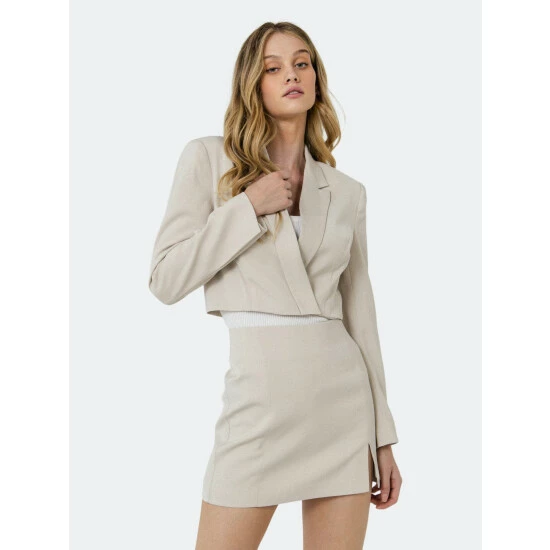 – Button closure- Cropped blazer- Shoulder pad- Long sleeve
