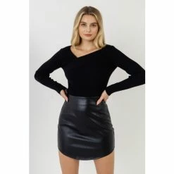 – Cross wrap over- Long sleeve- Rib knit sweater- Regular length- Fitted- Shell: 52% Rayon 29% Polyester 19% Nylon- Total length: 20.25″, Bust: 24.50″