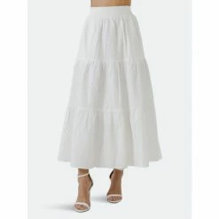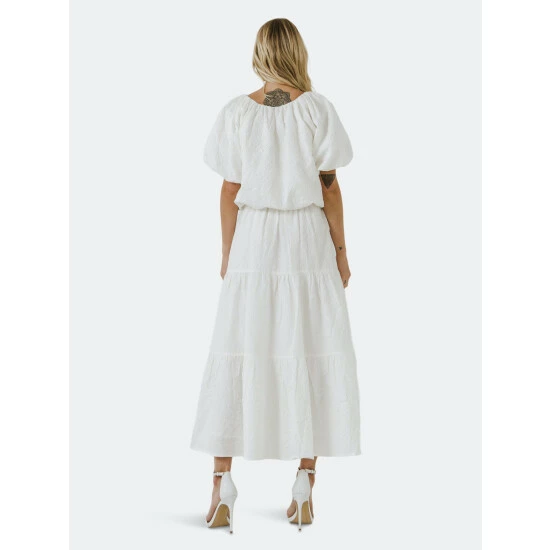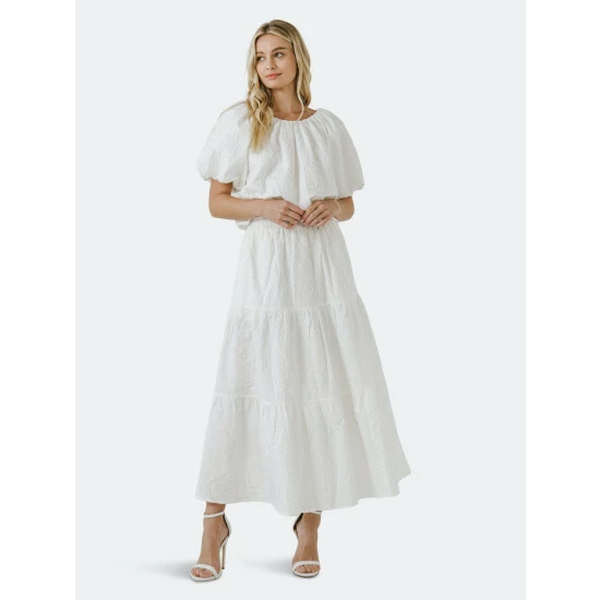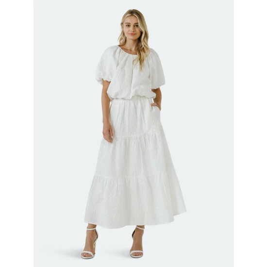 This floral texture midi skirt is perfect for a casual day out. the white long skirt can be matched with any top and the floral textured fabric makes it oh so pretty. You’ll love wearing this skirt for any spring or summer occasion. Matching top available to create a coordinating look.