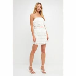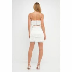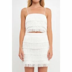Take your style up a notch with this fun and flirty fringe crop top. The matching mini skirt is available in white for a versatile look that you can wear anywhere. Whether you’re dressing up for a night out or just want to feel confident and sexy, this set has got you covered.