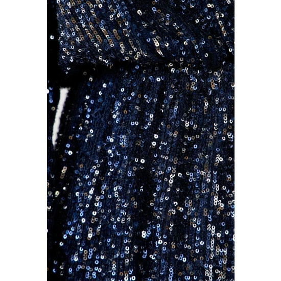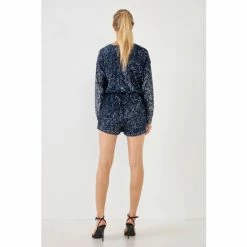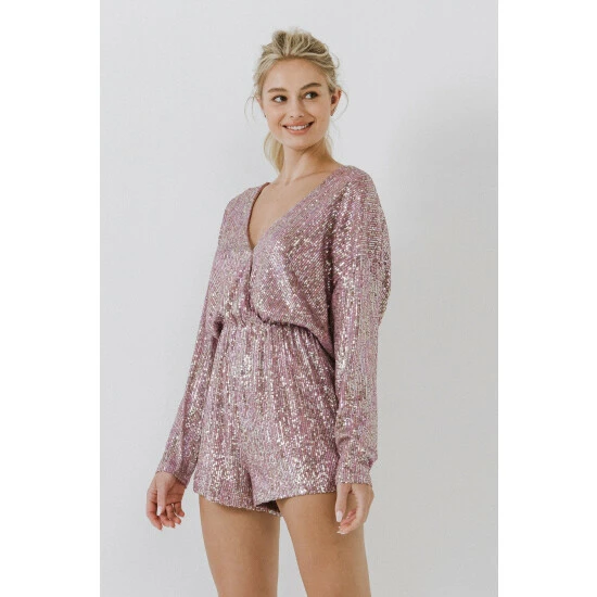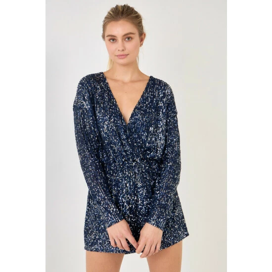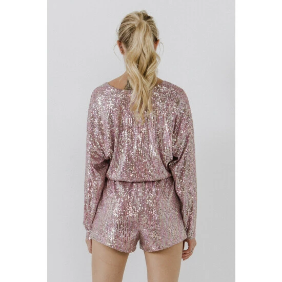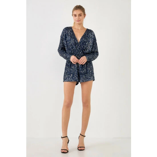 – Sequins- Wrap style- Tapered sleeves- Romper- Elastic waist- Lining- Total length: 31.5″, Bust: 45″, Inseam: 2″