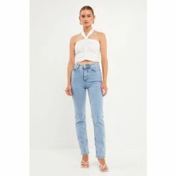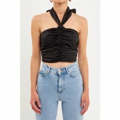 This ruched solid top with halter loop and side zipper is the perfect addition to any wardrobe. The non sheer fabric and lining make it a versatile piece that can be dressed up or down. The cropped length and back partial smocking give it a flirty and fun look.