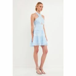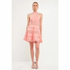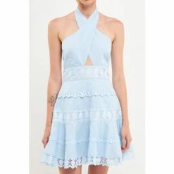 This halter neck lace trim dress is perfect. The crossed halter neck flatters your shoulders and neck, while the lace trimmed skirt adds a touch of elegance. The center back invisible zipper closure ensures a perfect fit, and the smocking detail at the back bodice adds a bit of flair.