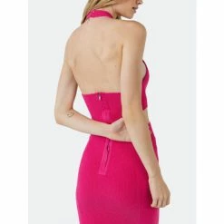 – Halter neck- Side cut out details- Center back zipper closure- Total length: 34″, bust: 30″