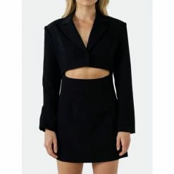 Dress up or down your look in this short blazer-dress hybrid. Showing off the right amount of skin, the lapel and single button reveal a hint of skin as you walk away. Shoulder-baring cut-out flaunts your shoulders and doesn’t melt under the pressure. Roll-up sleeves and back detail provide a touch of laid-back charm.
