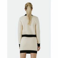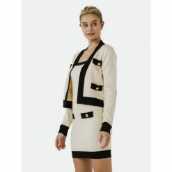 A classic and iconic buttoned cardigan is always in style. The design of this buttoned cardigan is inspired by ornamental buttons with a contrast on the cuffs, neckline, and hemline. Pair this with a matching top and skirt set and you’re set for the day