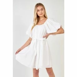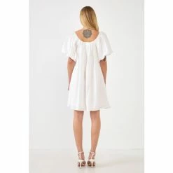– Pleated round neck- Balloon short sleeves- Mini length- Lined
