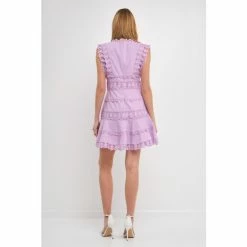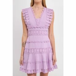 Looking for a pretty little dress to wear this spring? Well, look no further than our Plunging Neck Lace Trim Dress! This mini dress is fitted and features lace trim detail in lilac. It’s made of 100% cotton, making it perfect for warm weather days. So grab this dress before it sells out and enjoy looking beautiful all season long!