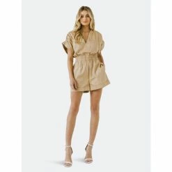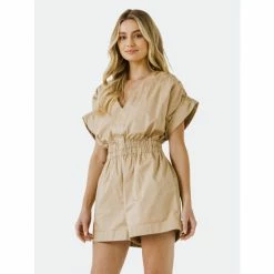 – Ruched shoulder- Elastic waistband- V neckline- Exclusive of elastic- Height 5’8”(173cm) / bust 32”(81cm) / waist 25”(67cm) / hip 35”(89cm)- Total length: 32.25″, bust: 57″, inseam: 2.1″