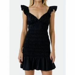 – Mini length- Ruffle detail on sleeves- Smocked skirt- Exclusive of elastic- Height 5’9″(175cm) / bust 34″(86cm) / waist 26”(67cm) / hip 35”(89cm)- Total length: 35″, bust: 34″