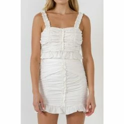 Take your style to the next level with this Ruffled Ruched Cropped Top. This top features a textured solid, ruched bodice, ruffled shoulder straps, lining, ruffled hemline, and side zipper. Pair this top with your favorite jeans or shorts for a complete look.