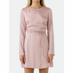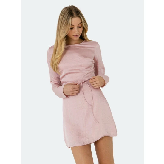 – Satin fabric- Flare skirt silhouette- Long sleeves- Back zipper closure with hook-and-eye- Spaghetti waist tie- Total length: 34.50″, Bust: 35″