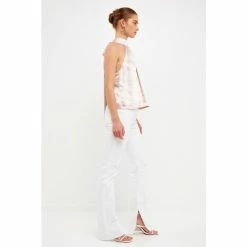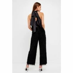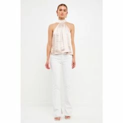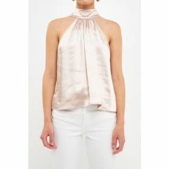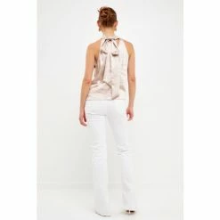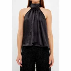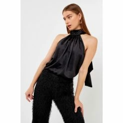 Get dressed up with this luxurious satin top. With its elegant halter neck and pretty back bow, this top makes a statement. The shirring detail at the waist gives it a figure flattering fit. Perfect for special occasions or a night out on the town, this top is sure to turn heads.