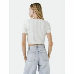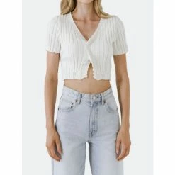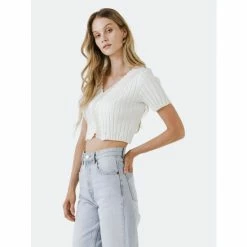 – Knit rib top- Cropped length- Short sleeve- Ruffle placket- V neckline- Hand wash cold- Do not bleach- Do not tumble dry- Iron low- Shell: 55% cotton 45% nylon- Imported, china- Total length: 16.75″, bust: 25.50″