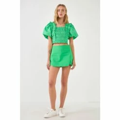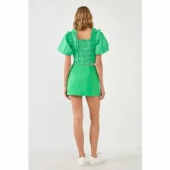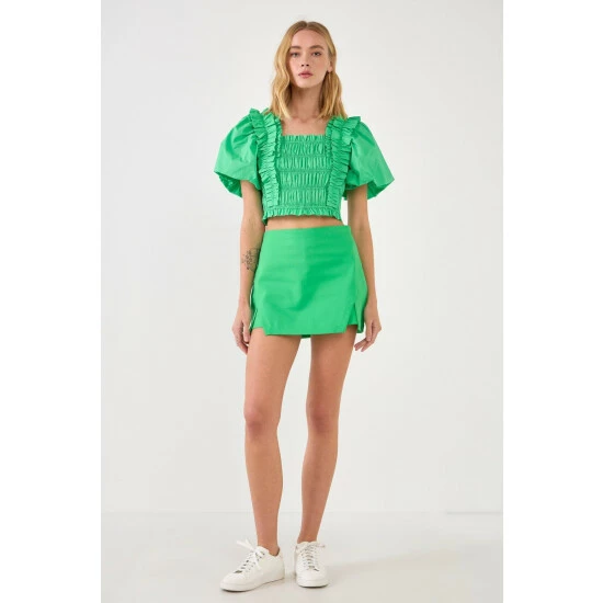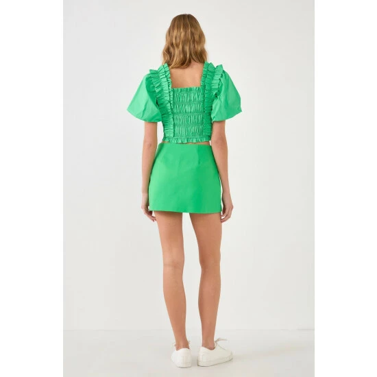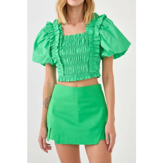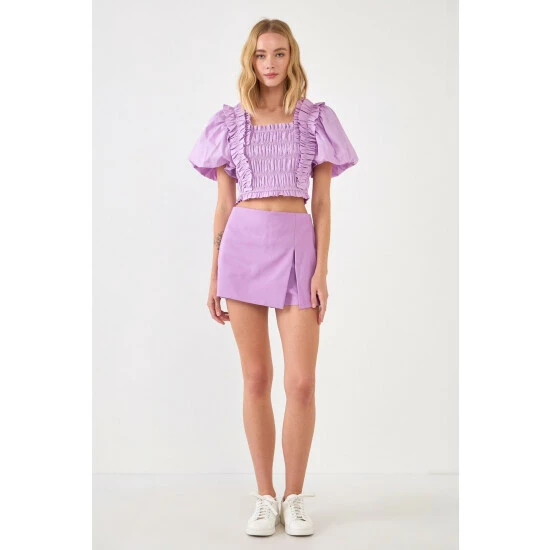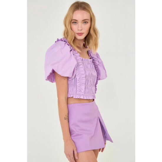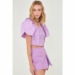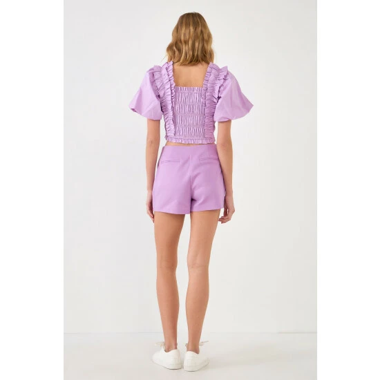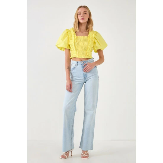 This lovely blouse is sure to turn heads. The smocked bodice and folded ruffle detail give this blouse a touch of elegance, while the short puff sleeve adds a fun and flirty touch. The lined bodice ensures a comfortable and flattering fit.