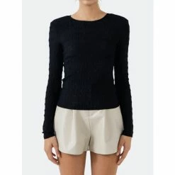 Need a top to take you from work to play? Elevate your basic with this textured-fitted top. With a subtle shoulder pad detail, this fabric is perfect from day to night. Wear it with some skinny jeans and boots for an evening out or throw on some flats and a blazer for the office.