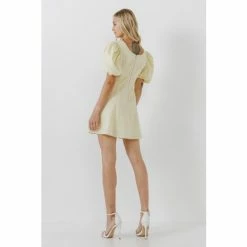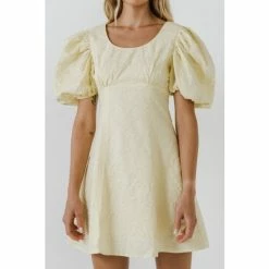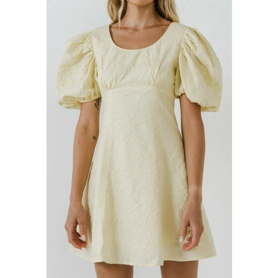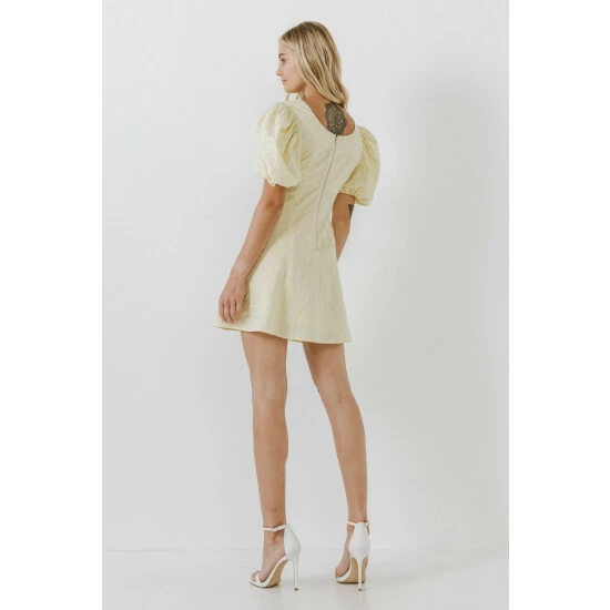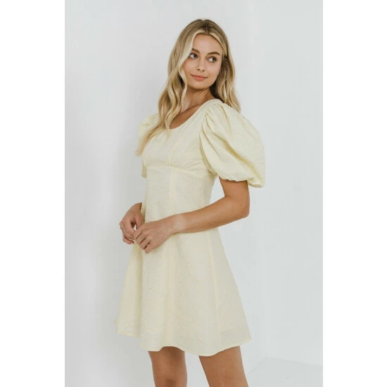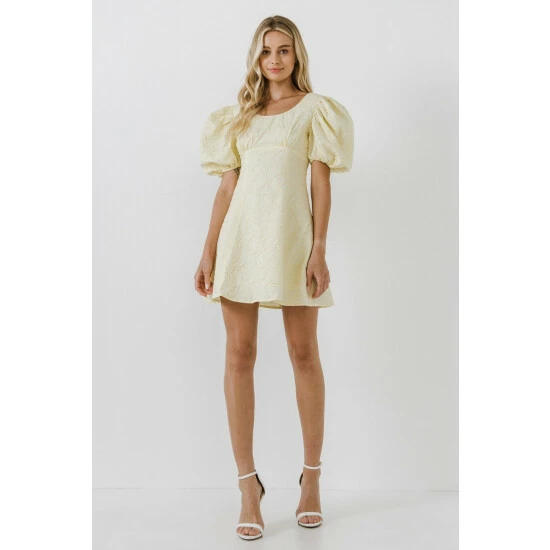 This is a beautiful mini dress made from floral textured fabric. It has a fitted bodice and flared bottom, making it perfect for showing off your curves. The puff sleeves add a touch of girly charm, and the mini length makes it perfect for warm weather occasions.