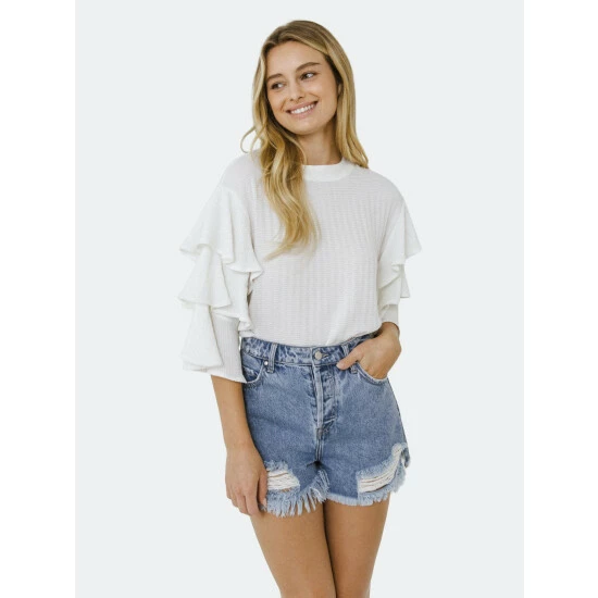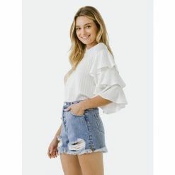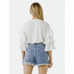 – Textured fabric- Neck band- Tiered ruffle at 3/4 sleeves- Zipper closure at back- Total length: 23″ Bust: 39″